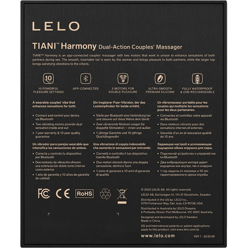 The LELO TIANI⢠Harmony is an app-connected vibrator for couples with two motors that work in unison to enhance the sensations of both partners during sex. The smooth, insertable tail is inserted into the vagina bringing sublime pleasure to both partners, while the external arm offers satisfying vibrations to stimulate the clitoris. TIANI⢠Harmony features four default pleasure settings, which can be configured up to 10 using the designated LELO app.