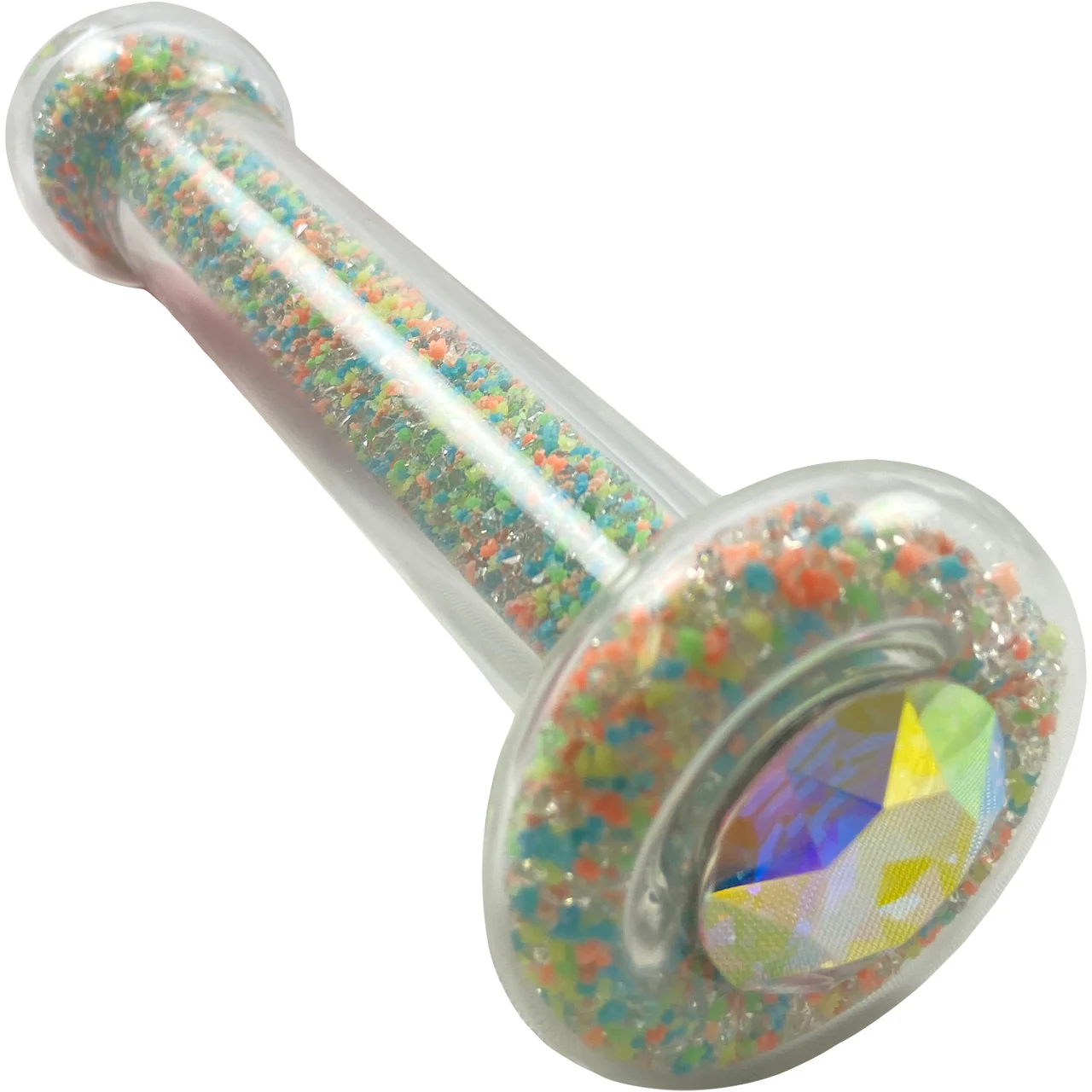 Look within while twisting this special glass dildo in your fingers to check out the colorful tiny crystals. Feel the coolness of the glass; or if you prefer, warm it in your hands before party time. Watch how each of the delightful colors magnify under any lubricant you apply to the plug, or your body. Trying is believing, the tapered tip promises smooth pleasure and your patience is worth the extra fun.