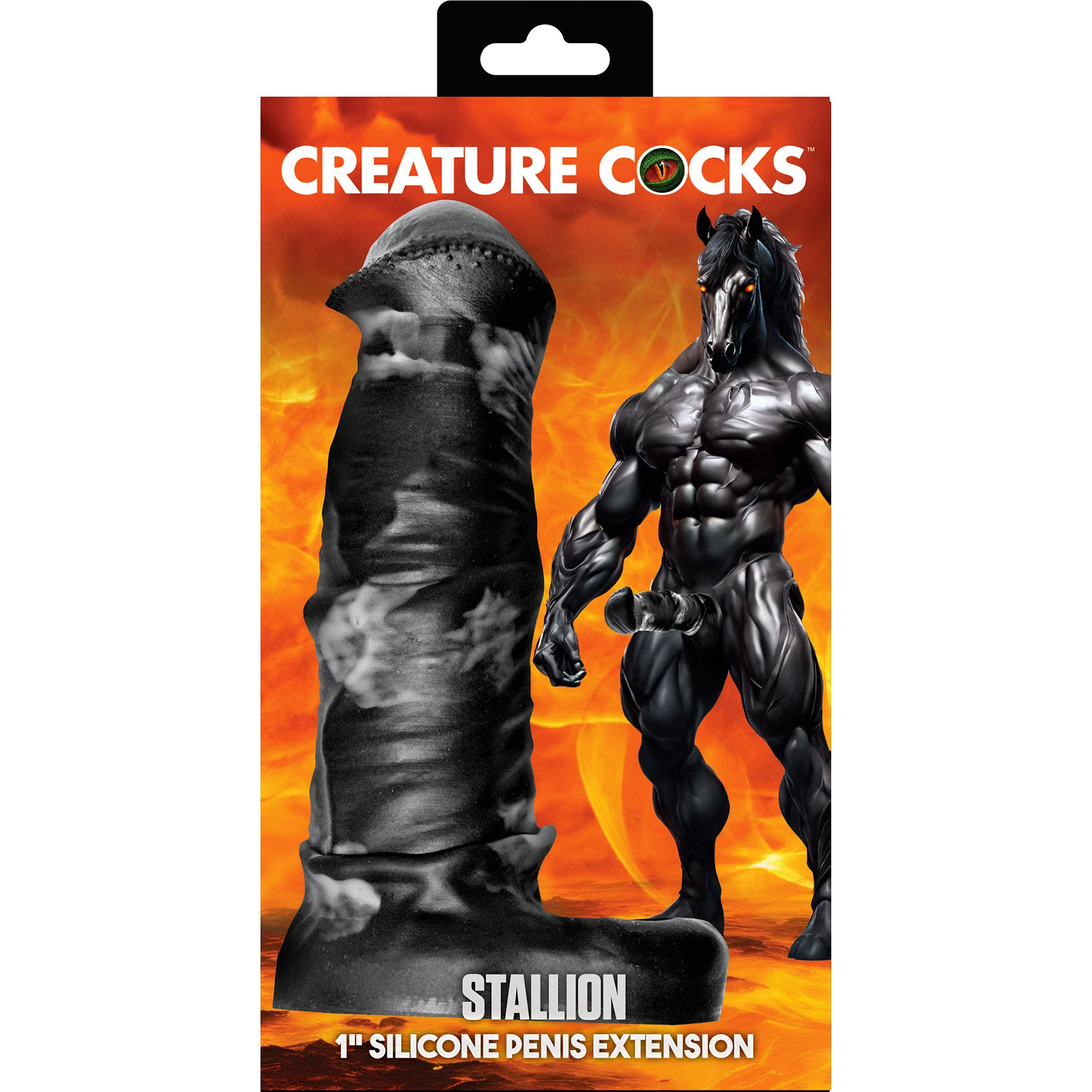 Elevate your intimate moments with the Stallion Silicone Penis Extension by Creature Cocks. This striking sheath adds impressive length and girth, transforming you into a powerful equine stud that captivates your partner. Its wide, flared horsehead design enhances deep, pleasurable sensations, while the realistic veined black and gray shaft offers a lifelike feel.